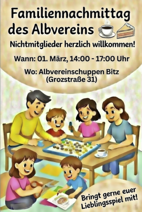 wir wollen uns zu einem gemütlichen Familiennachmittag treffen! Gemeinsam spielen, basteln, malen – während die Eltern bei Kaffee und Kuchen entspannen dürfen 😄