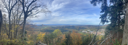 Unser Weg führt weiter nach Osten, stets am Trauf entlang und immer wieder mit schönen Ausblicken, bis zum Hirschkopf, wo wir dann über dem Gelände des spektakulären Bergrutsches von 1983 stehen. Über den Aussichtspunkt „Saurücken“ gelangen wir zurück zum Dreifürstenstein und hinab zu unserem Ausgangspunkt.