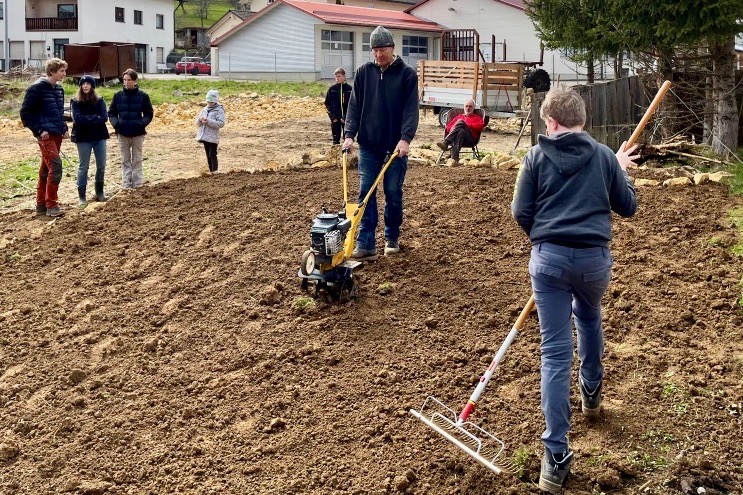 Mit Spaten, Rechen und Bagger wurde aus einem Stück Land ein kleiner Garten, in dem nun bald Gemüse angepflanzt werden kann.