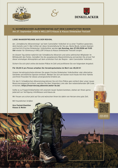 der „Schwäbische Albvereinstag“ auf dem Cannstatter Volksfest ist zu einer Tradition geworden, denn bereits zum 11. Mal richten wir diese Veranstaltung für Sie aus. Beste Musik, leckere Speisen und herrlich-frisches Dinkelacker Volksfestbier werden am Sonntag, den 27.09.2026 ab 11:00 Uhr wieder für Stimmung in WELLER’S Klauss & Klauss Dinkelacker Festzelt sorgen.