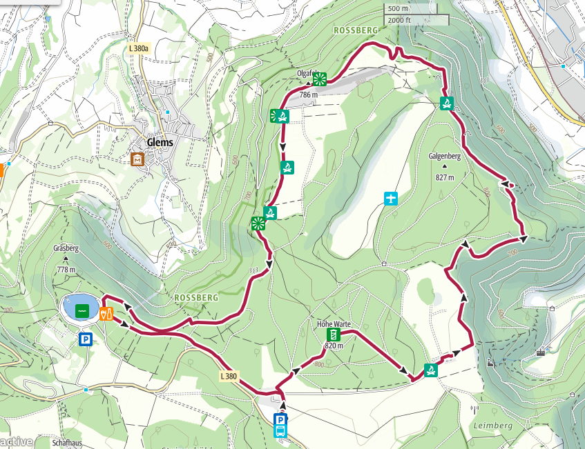 Wir starten am Gestütshof St. Johann. Schnell erreichen wir die „Hohe Warte.“ Vom 23 Meter hohen Turm ist bei schönem Wetter eine Rundumsicht bis zu den Alpen möglich. Nur wenig später erreichen wir den Grünen Fels mit schönem Blick auf die Ortschaften Glems und Metzingen sowie auf die Achalm. Entlang der Hangkante, vorbei am Wiesfels, gelangen wir zum Segelfluggelände auf dem Rossberg.