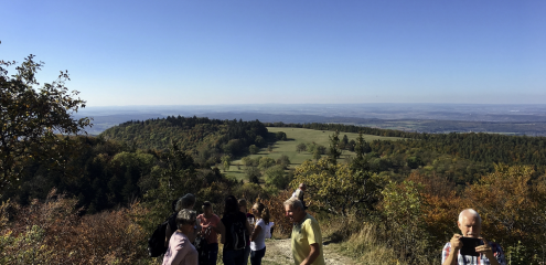 Der erste Teil unserer Wanderung verläuft auf dem Premiumwanderweg „Hochgehkämpft.“ Wir starten beim Wanderparkplatz am Schützenhaus Gönningen. Steil bergauf in Serpentinen erreichen wir nach ca. 280 hm das Quenstedt-Denkmal mit herrlichem Ausblick und kurze Zeit später den Roßberg.