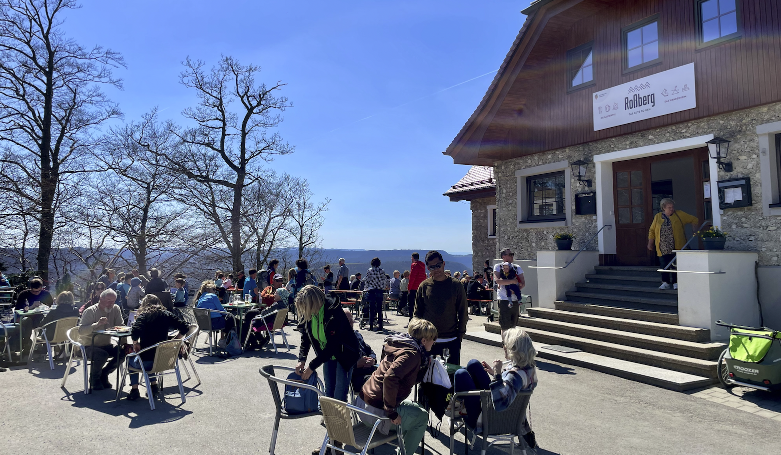 Im Wanderheim Roßberghaus mit Biergarten kehren wir gemütlich ein (die Speisekarte kann eingesehen werden unter:
