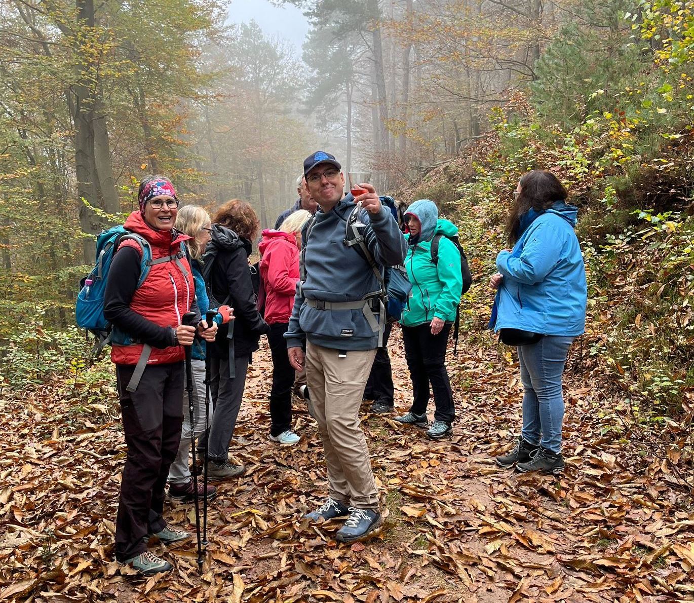 Am Samstag stand die erste Wanderung auf dem Programm. Die Pfalz und der Woi – das gehört zusammen. Und so hatte jeder im Rucksack eine Flasche Pfälzer Weiß-, Weißherbst oder Rotwein, die Stephan für die Weinprobe unterwegs tags zuvor schon besorgt hatte.